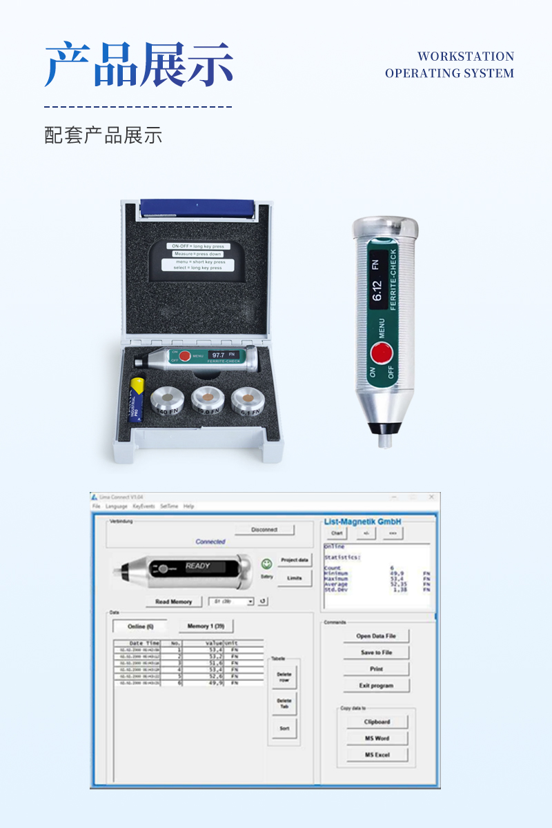 为了进一步处理测量数据,您可以将FERRITE-CHECK 140铁素体含量检测仪与移动Android和iOS设备配对。或者与一台Windows电脑通信。这是由低功耗蓝牙技术(BLE)实现的。使用Lima Connect应用程序,您可以管理项目并在照片上分配测量点。测量结果可以统计评估和图形显示。这款应用适用于安卓、iOS和Windows系统,软件免费的。