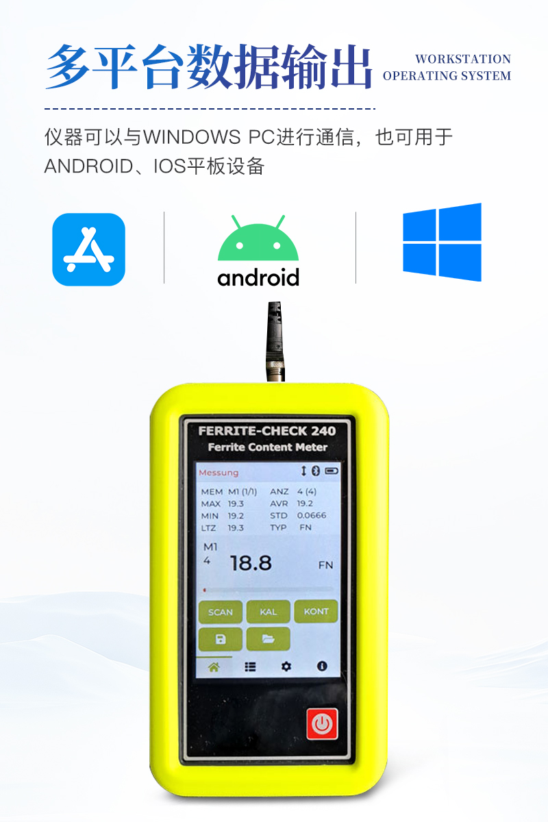 FERRITE-CHECK 240铁素体含量检测仪采用分体式的设计,使用方便,仪器符合Basel标准DIN EN ISO 8249,使用磁感应法测量奥氏体钢和双相钢中的铁素体含量。