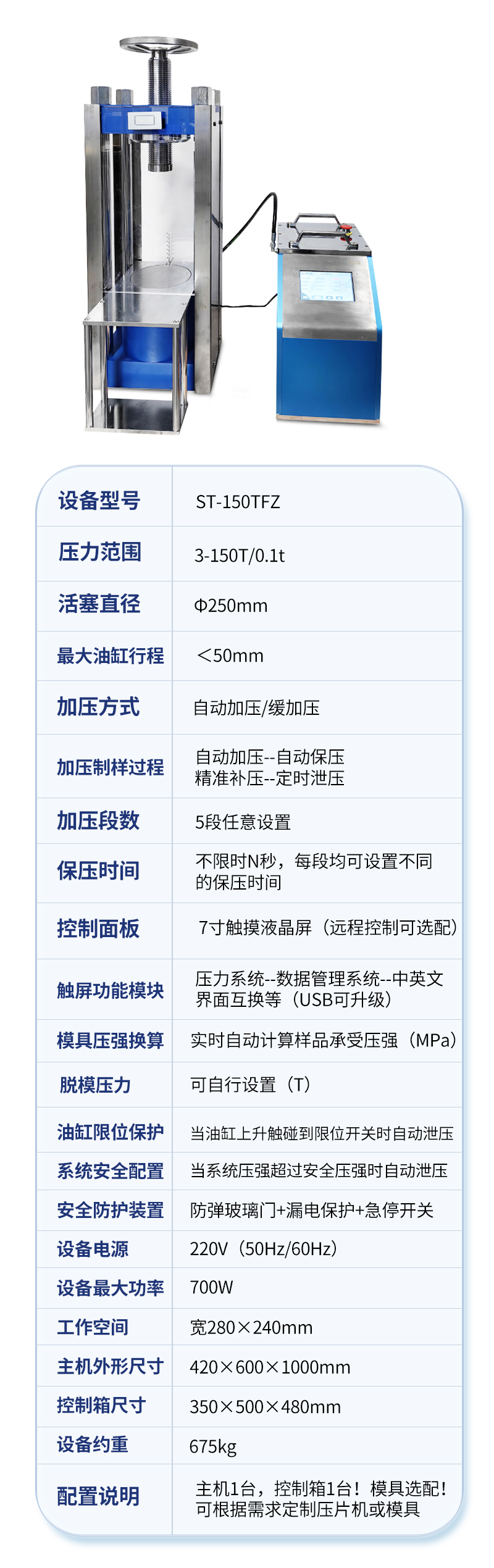 | 加压制样过程 | 自动加压--自动保压--精准补压--定时泄压 |