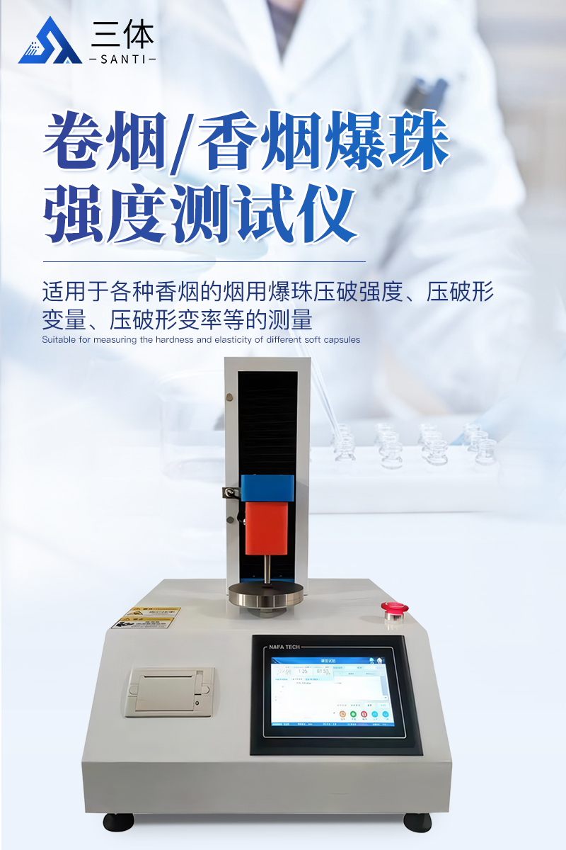 香烟爆珠强度测试仪适用于各种香烟的烟用爆珠压破强度、压破形变量、压破形变率等的测量,为选择产品的配方和工艺提供参考数据,该机也叫烟用爆珠压破强度测试仪, 爆珠强度测量仪,香烟胶囊爆珠颗粒压力形变检测仪,香丸爆珠强度测试仪,香烟爆珠脆性胶囊强度测试仪等